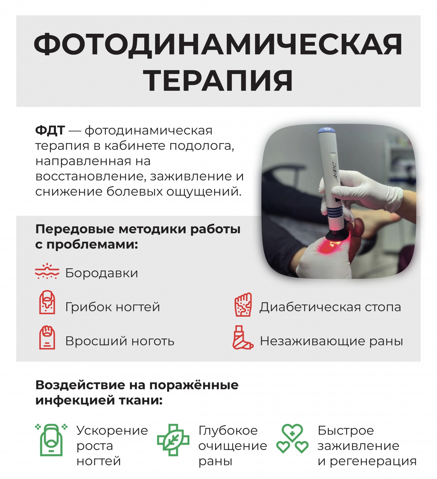 Фотодинамическая терапия (ФДТ) в подологии представляет собой эффективный метод лечения, основанный на использовании светочувствительных веществ и света для воздействия на ткани. Этот метод часто применяется для лечения кожных заболеваний, включая грибковые инфекции, воспаления, а также для заживления различных кожных повреждений